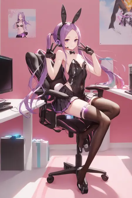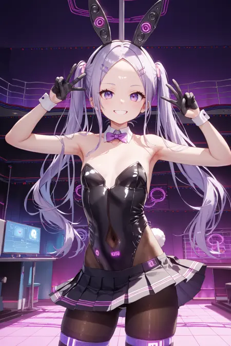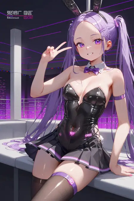 <lora:LoChan_Pony_V1:0.9>보라색 눈, 이마, 보라색 머리, 긴 머리, 더블테일, 토끼 귀, 토끼 머리핀,