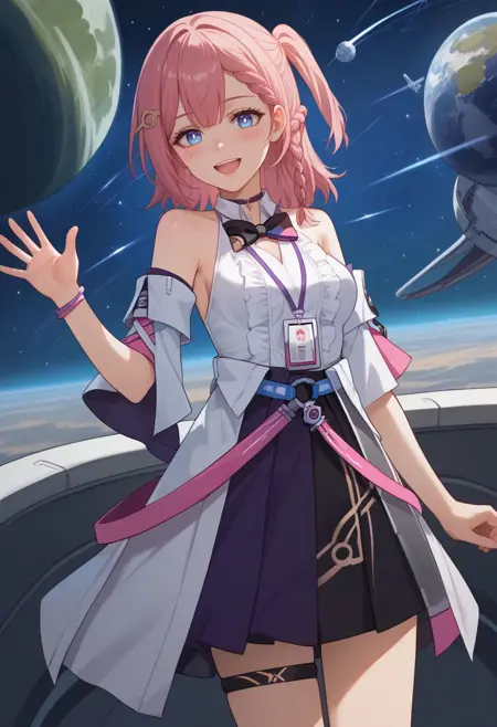 Appearance : astadef, blue eyes, pink hair, medium hair, braid, one side up, hair ornament, hairclip, medium breasts,