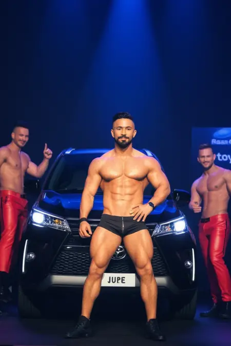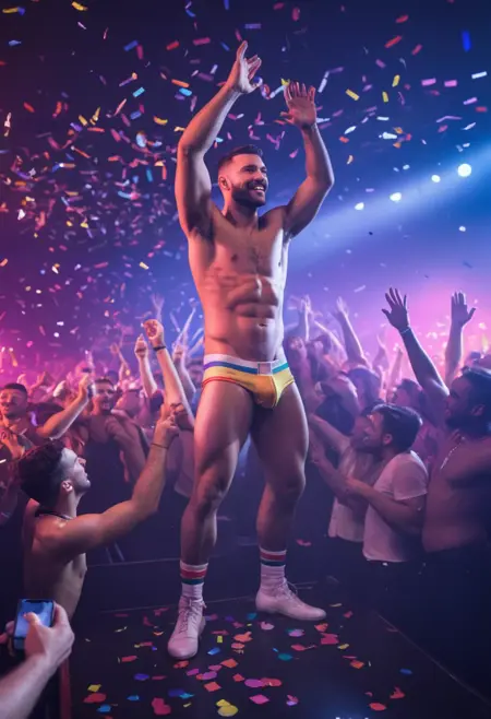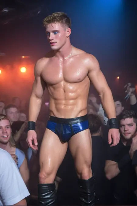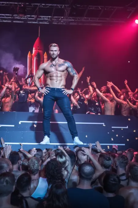 관객 앞에서 펼쳐지는 남성 스트립 쇼의 분위기를 포착하는 것을 목표로 합니다. 근육, 오일로 윤기 나는 몸체, 강렬한 조명, 퍼포머들의 미소를 기대하세요.