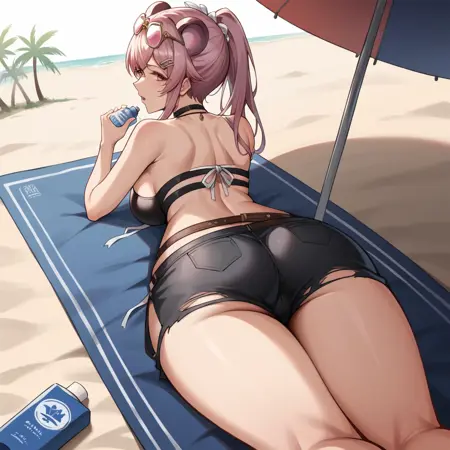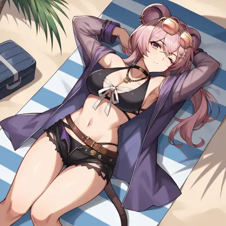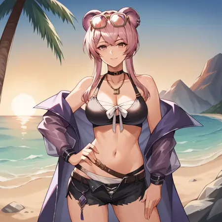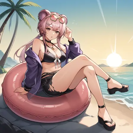 Lin_Swimsuit,黑色比基尼,黑色比基尼上衣,白色比基尼下装,太阳镜,头戴眼镜,珠宝,超短裤,白色丝带,敞开式短裤,露胸,黑色短裤,紫色夹克,透明夹克,露肩,发夹,项链,腰带,黑色项圈,