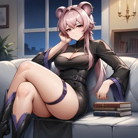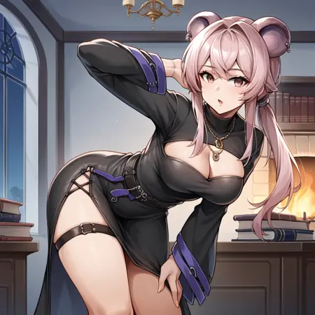 Lin_Def,裸腿,露胸剪裁,大腿绑带,黑色连衣裙,双排扣连衣裙,高领,项链,长袖,黑色袖子,紫色袖子,宽袖,铅笔裙,腰带,紫色肩带,珠宝,