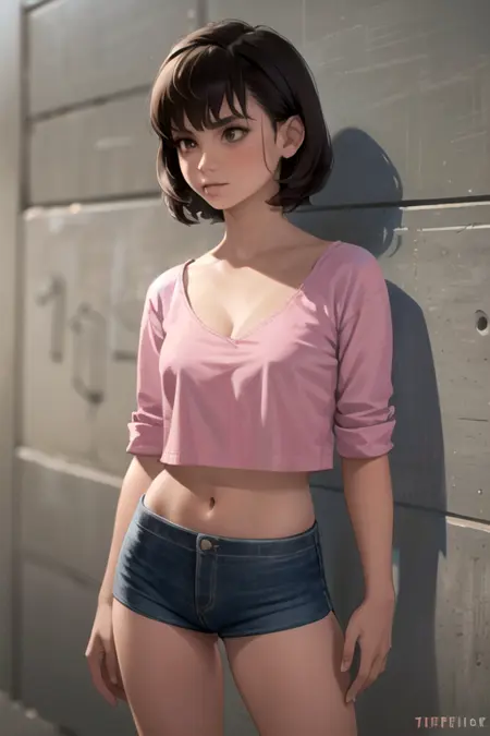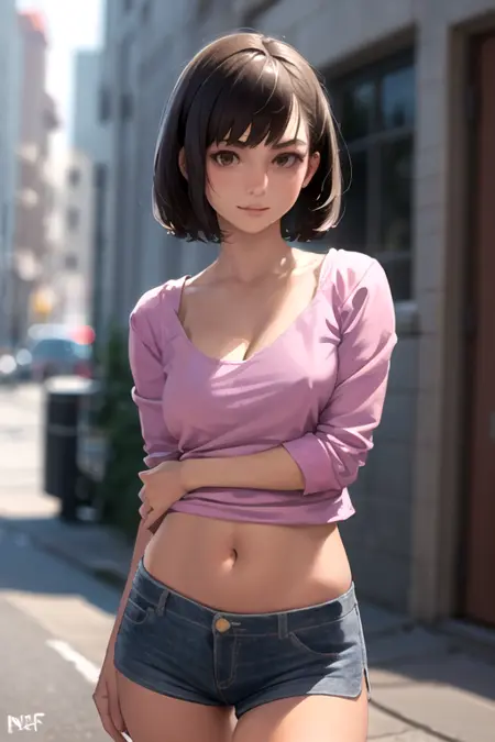 TiffanyCox, 1girl, solo, short hair, brown hair, pink shirt, black hair, navel, cleavage, brown eyes, medium breasts, short shorts, midrif, denim shorts