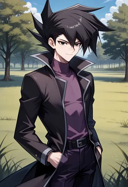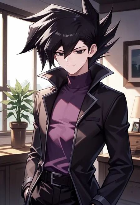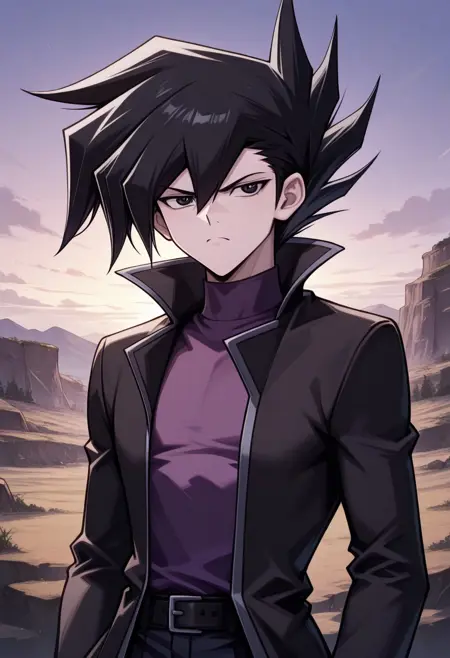 chazzgx、1人男の子、男性焦点、シングル、黒い目、黒髪、トゲトゲした髪、前髪、目の間の髪、シャツ、紫のシャツ、タートルネック、コート、黒いコート、長袖、開いたコート、開いた服、ベルト、ズボン、黒いズボン、靴、茶色の靴、