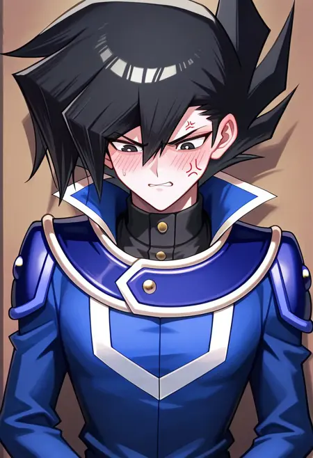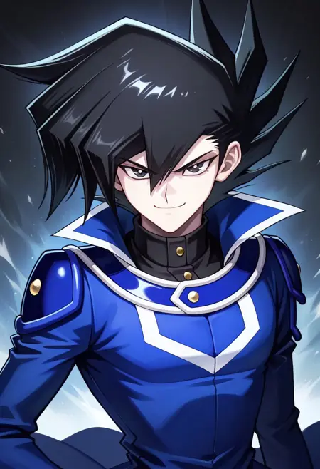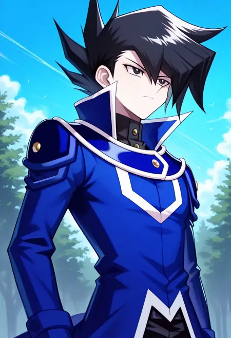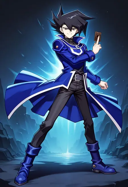 chazzgx、1人男の子、男性焦点、シングル、黒い目、黒髪、トゲトゲした髪、目の間の髪、デュエルアカデミーのユニフォーム(Yu-Gi-Oh! GX)、オベリスク青いユニフォーム、シャツ、黒いシャツ、タートルネック、コート、青いコート、長袖、ベルト、ズボン、黒いズボン、ブーツ、青い靴