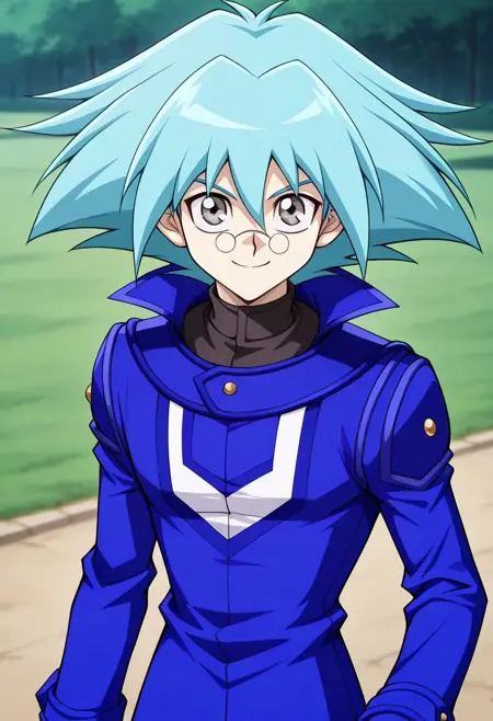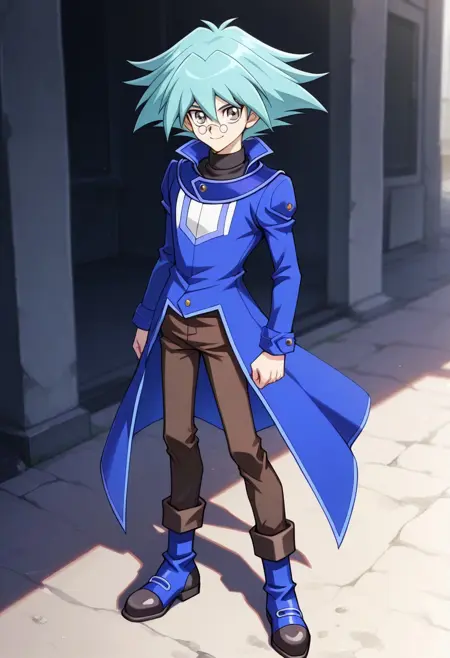 마루후지 쇼, 1명의 남자, 남성 중심, 혼자, 회색 눈, 안경, 둥근 안경, 핀세네, 청록색 머리, 스파이크 헤어, 눈 사이에 머리카락, 듀얼 아카데미 유니폼 (유기오! GX), 셔츠, 검은 셔츠, 터틀넥, 코트, 파란 코트, 긴 소매, 바지, 갈색 바지, 부츠, 파란 신발,
