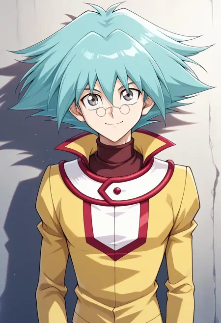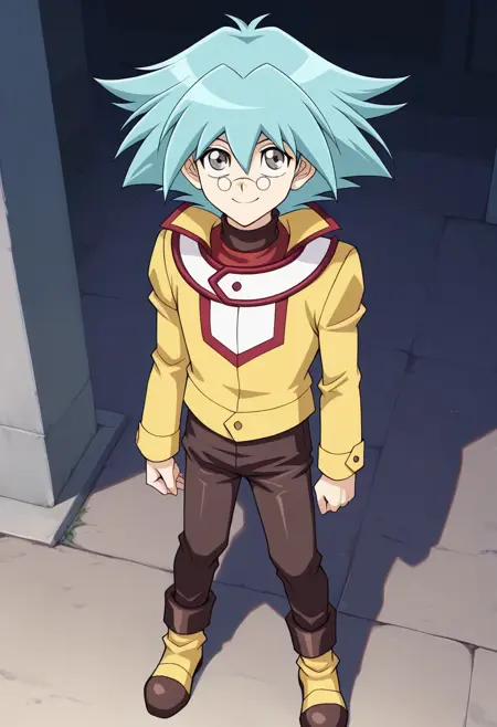 마루후지 쇼, 1명의 남자, 남성 중심, 혼자, 회색 눈, 안경, 둥근 안경, 핀세네, 청록색 머리, 스파이크 헤어, 눈 사이에 머리카락, 듀얼 아카데미 유니폼 (유기오! GX), 셔츠, 빨간 셔츠, 터틀넥, 재킷, 노란 재킷, 긴 소매, 바지, 갈색 바지, 부츠, 노란 신발,