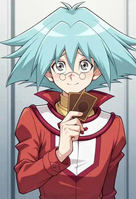 마루후지 쇼, 1명의 남자, 남성 중심, 혼자, 회색 눈, 안경, 둥근 안경, 핀세네, 청록색 머리, 스파이크 헤어, 눈 사이에 머리카락, 듀얼 아카데미 유니폼 (유기오! GX), 셔츠, 노란 셔츠, 터틀넥, 재킷, 빨간 재킷, 긴 소매, 바지, 회색 바지, 부츠, 빨간 신발,