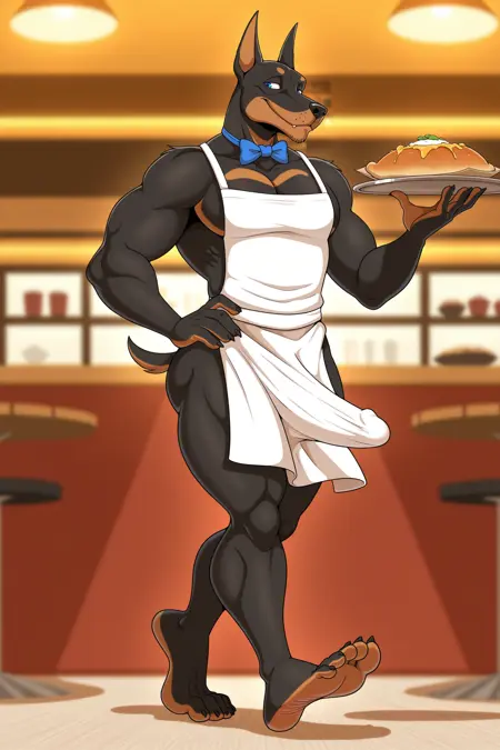 masterpiece, best quality, amazing quality, very aesthetic, high resolution, ultra-detailed, absurdres, newest, scenery, depth of field, scenery, volumetric lighting, by zp92, furry, furry female, anthro, toriel, undertale, kitchen, kitchen utensil, cake, pie, indoors, 1girl, solo, goat girl, horns, large breasts, blue eyes, goat ears, huge ass, wide hips, thick thighs, voluptuous, apron, naked apron, nude, areolae, covered nipples, looking back, looking down, seductive smile, eyes narrowed, snout, animal ears, oven mitts, huge breasts, from behind, looking at viewer, huge ass, tail, thighs, white fur, goat horns, thick thighs, body fur, food, smile, mature female, steam, standing, one leg raised, solo, toes, 3 toes, humanoid feet, feet, soles, foot focus, barefoot, from below, cowboy shot, bowl, holding pie, gloves, dutch angle