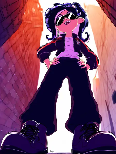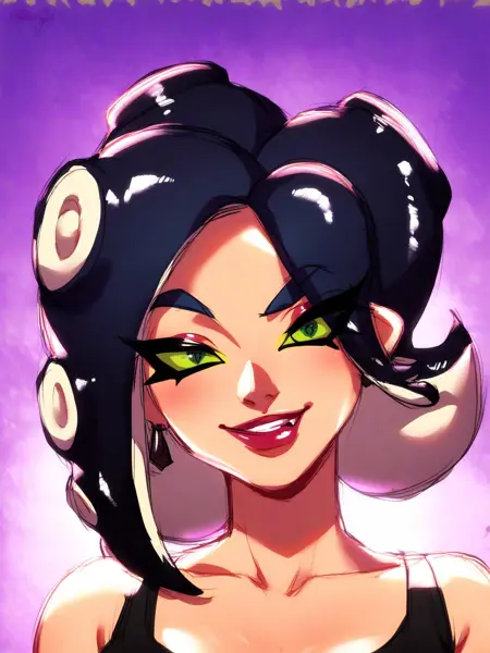 触发词为 "Octoling Girl"。若希望她们呈现经典的未戴面具的绿色眼睛外观,请输入 "green sclera"。
