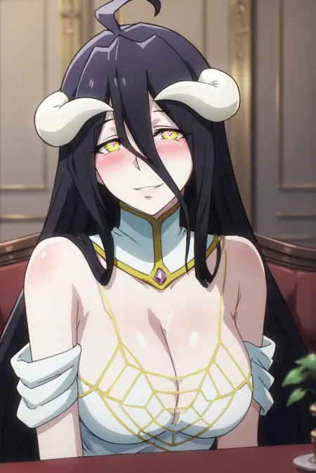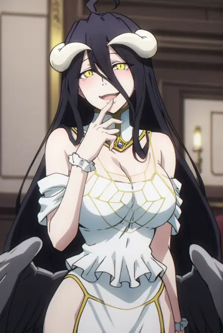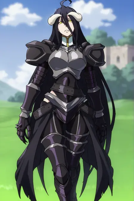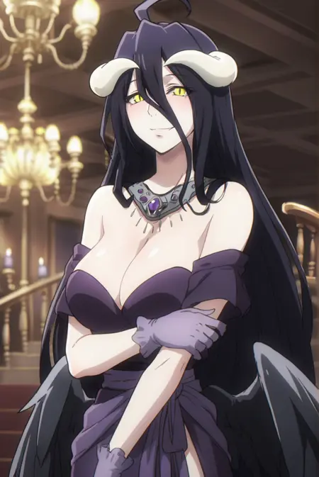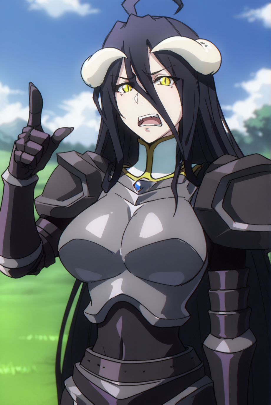 <lora:AlbedoXL-v4-07:0.7>, ChopioAlbedo, 黒髪, 非常に長い髪, 目の間に髪, 悪魔の角, 黄色い目, 縦に細長い瞳孔, ahoge, 視線を観察者に向けている,