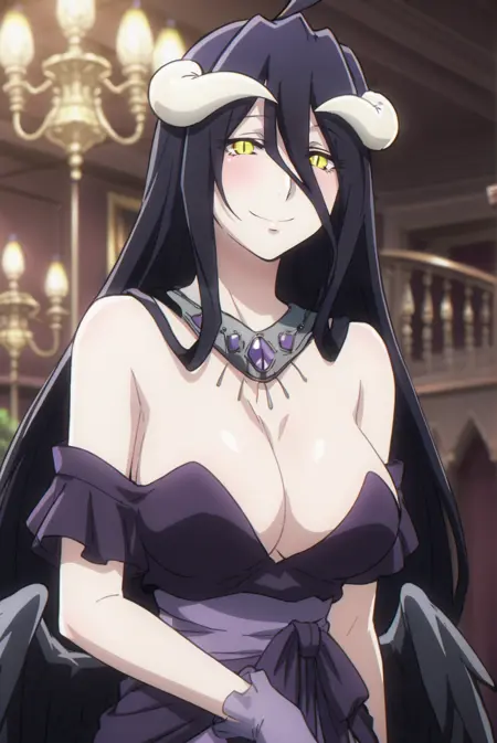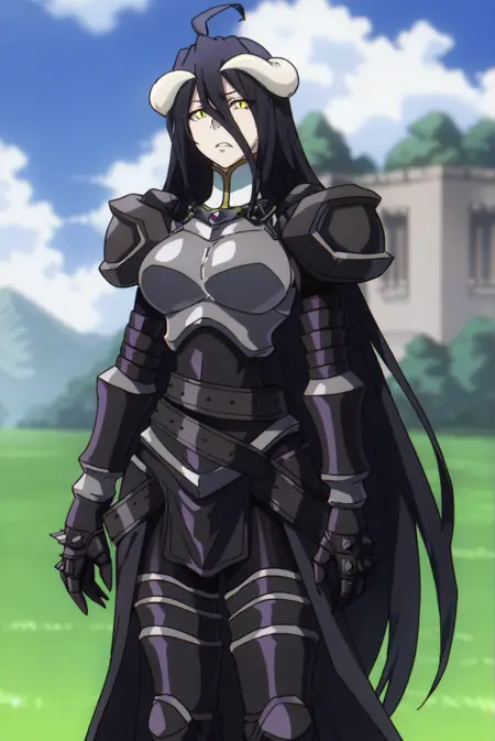 <lora:AlbedoXL-v4-07:0.7>, ChopioAlbedo, 검은 머리, 매우 긴 머리, 눈 사이의 머리카락, 악마의 뿔, 노란 눈, 수직 동공, 아호ge, 시청자 바라보기,