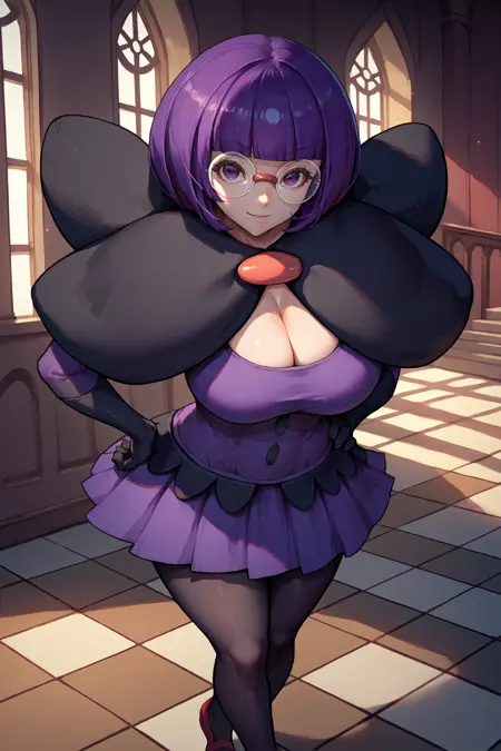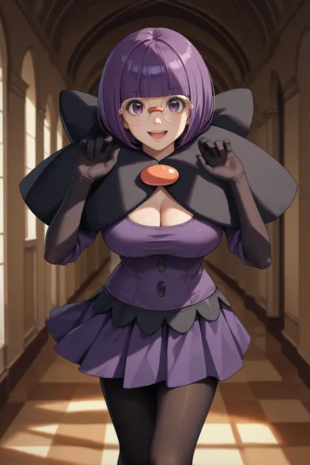 그녀의 전형적인 외모를 위해 "둥근 안경, 검은 카펠레, 큰 리본, 보라색 셔츠, 가슴 노출, 단추, 보라색 치마, 긴 소매, 검은 장갑, 팔꿈치 장갑, 검은 팬티스타킹"을 추가하세요.