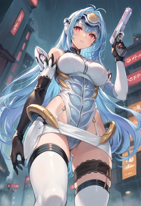 タグ(衣装):白い額当て、白い太ももブーツ、アンドロイド、白い肘手袋、黒い肘手袋、白いミニスカート、白いハイレグレオタード