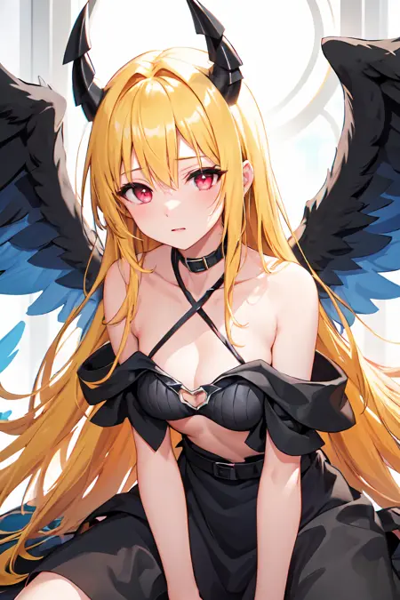 Darkness: phyami, yamidarkness, 1girl, solo, blonde hair, long hair, horns, red eyes, black wings, bare shoulders, hair intakes, collarbone, choker, demon horns, feathered wings, hair between eyes, black dress, demon girl, bangs, very long hair