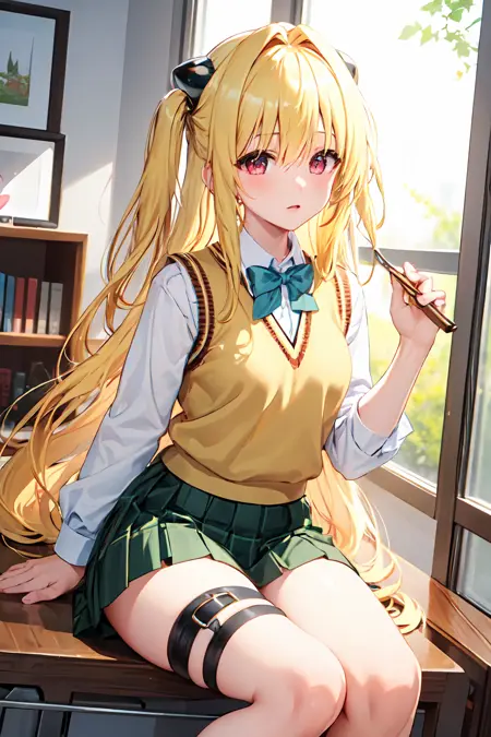 School uniform: phyami, yamisch, 1girl, long hair, solo, school uniform, hair ornament, hair between eyes, two side up, blonde hair, very long hair, skirt, red eyes, thigh strap, sweater vest, plaid skirt, plaid, socks, two side up, hair ornament, pleated skirt, kneehighs