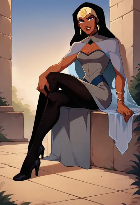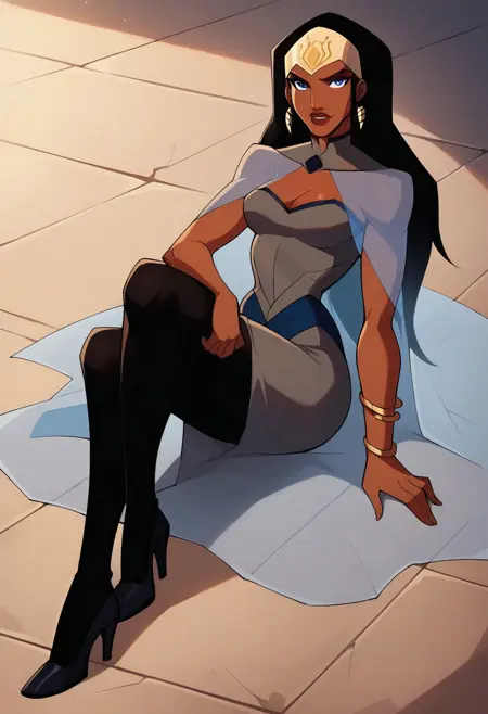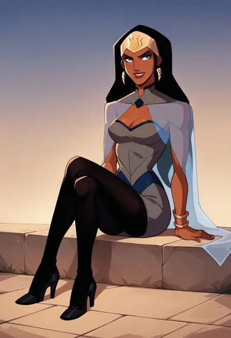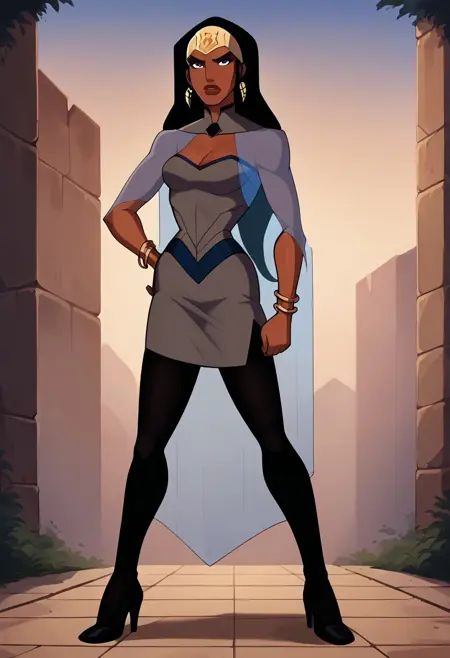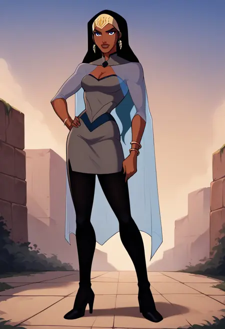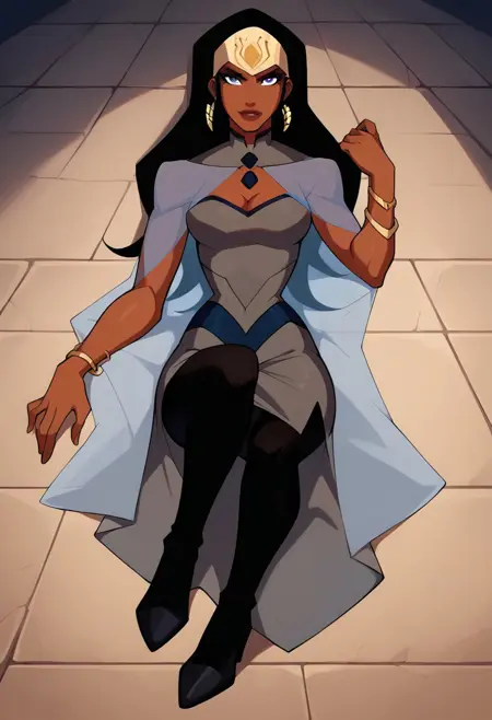 일반 프롬프트 추천: qbYJ, 검은 피부, 검은 머리, 긴 머리, 보석, 귀고리, 파란 눈, 메이크업, 립스틱, 가슴 부분 절개, 회색 드레스, 드레스 파란 테두리, 드레스 파란 디칼, 투명한 망토, 팔찌, 검은 스타킹, 검은 레깅스, 검은 신발, 검은 하이힐