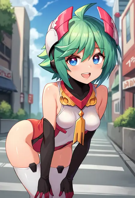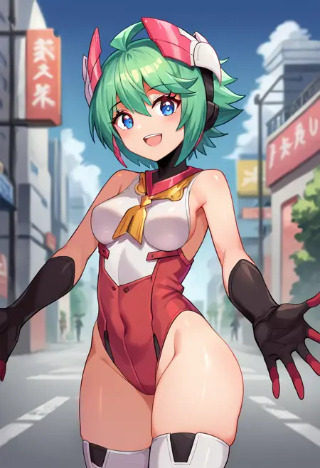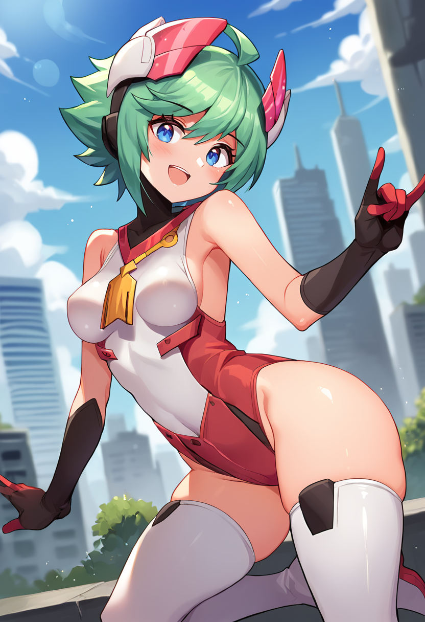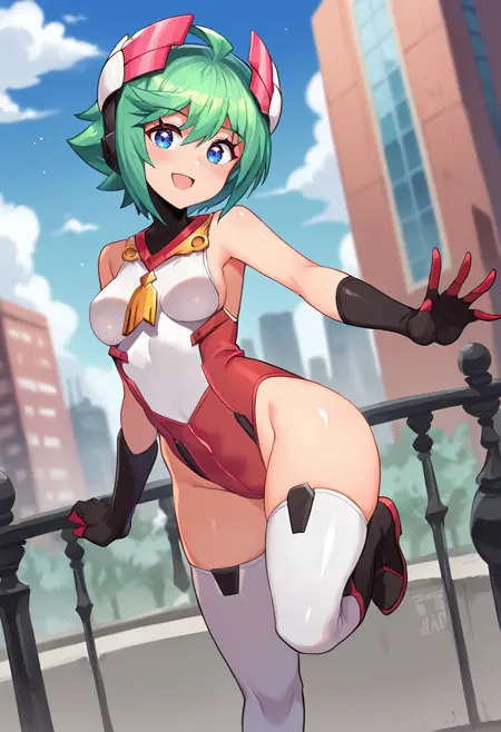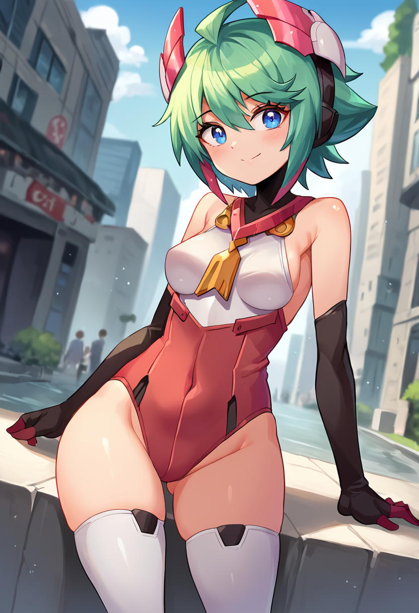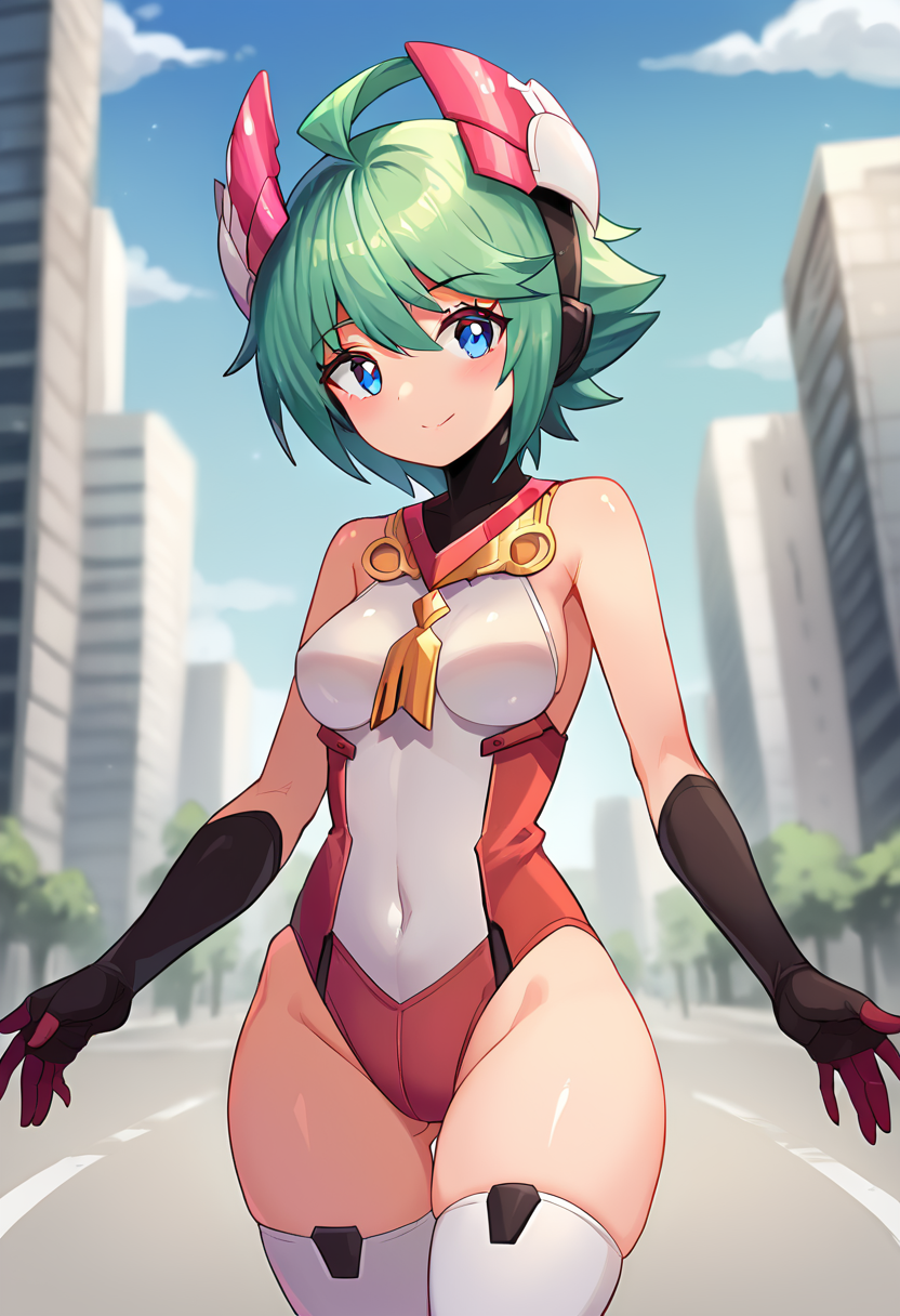 score_9, score_8_up, score_7_up, masterpiece, source_anime, 1girl, ct_ror0, green hair, short hair, blue eyes, ahoge, headgear, medium breasts, leotard, gold ascot, black turtleneck, elbow gloves, white thigh boots, looking at viewer, outdoors, city, depth of field, cowboy shot,