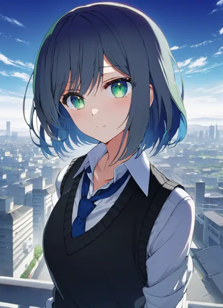 Recommended Prompts: blue hair, green eyes, medium hair, white shirt, sweater vest, black vest, blue necktie, skirt, multicolored hair or gradient hair