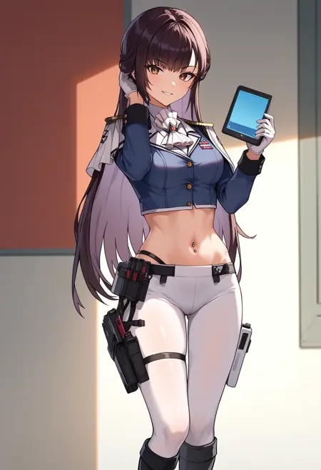 - white gloves, long sleeves, crop top, white pants, uniform, military uniform, ascot, epaulettes, blue jacket, thigh strap