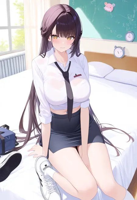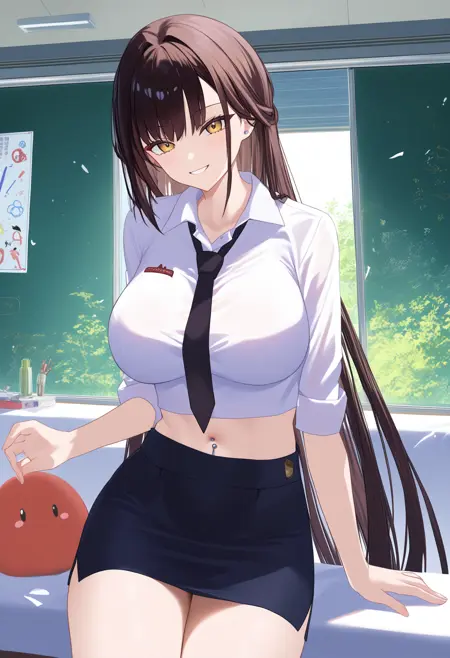 - MarcianaDef or Marcianaschool, long hair, bangs, large breasts, brown hair, yellow eyes,
