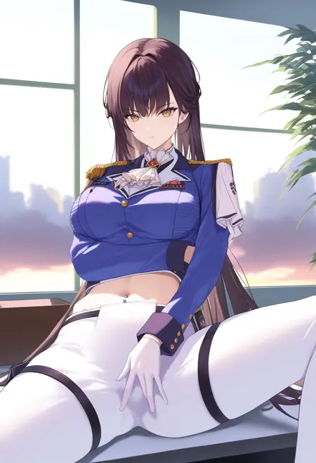 - white gloves, long sleeves, crop top, white pants, uniform, military uniform, ascot, epaulettes, blue jacket, thigh strap