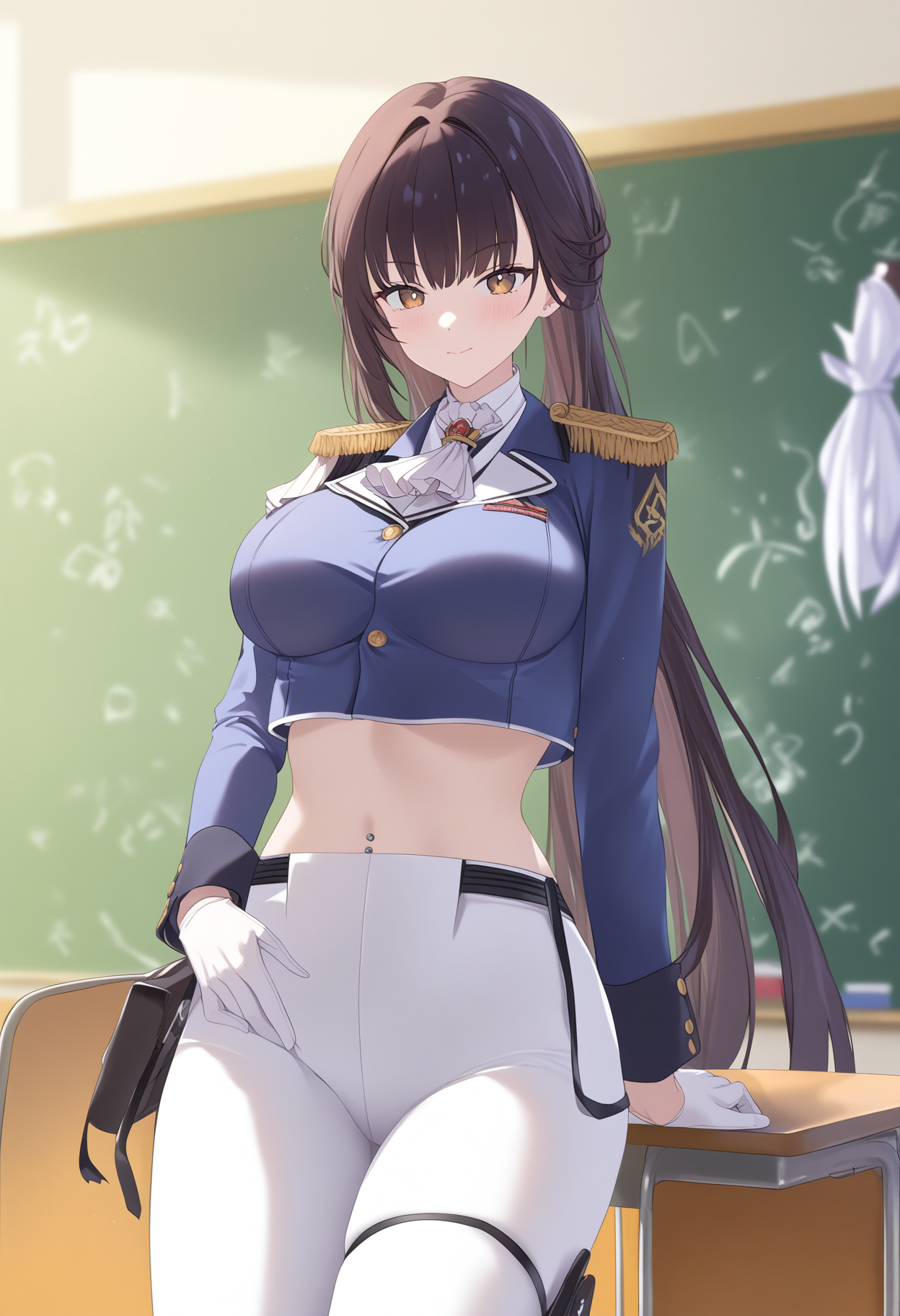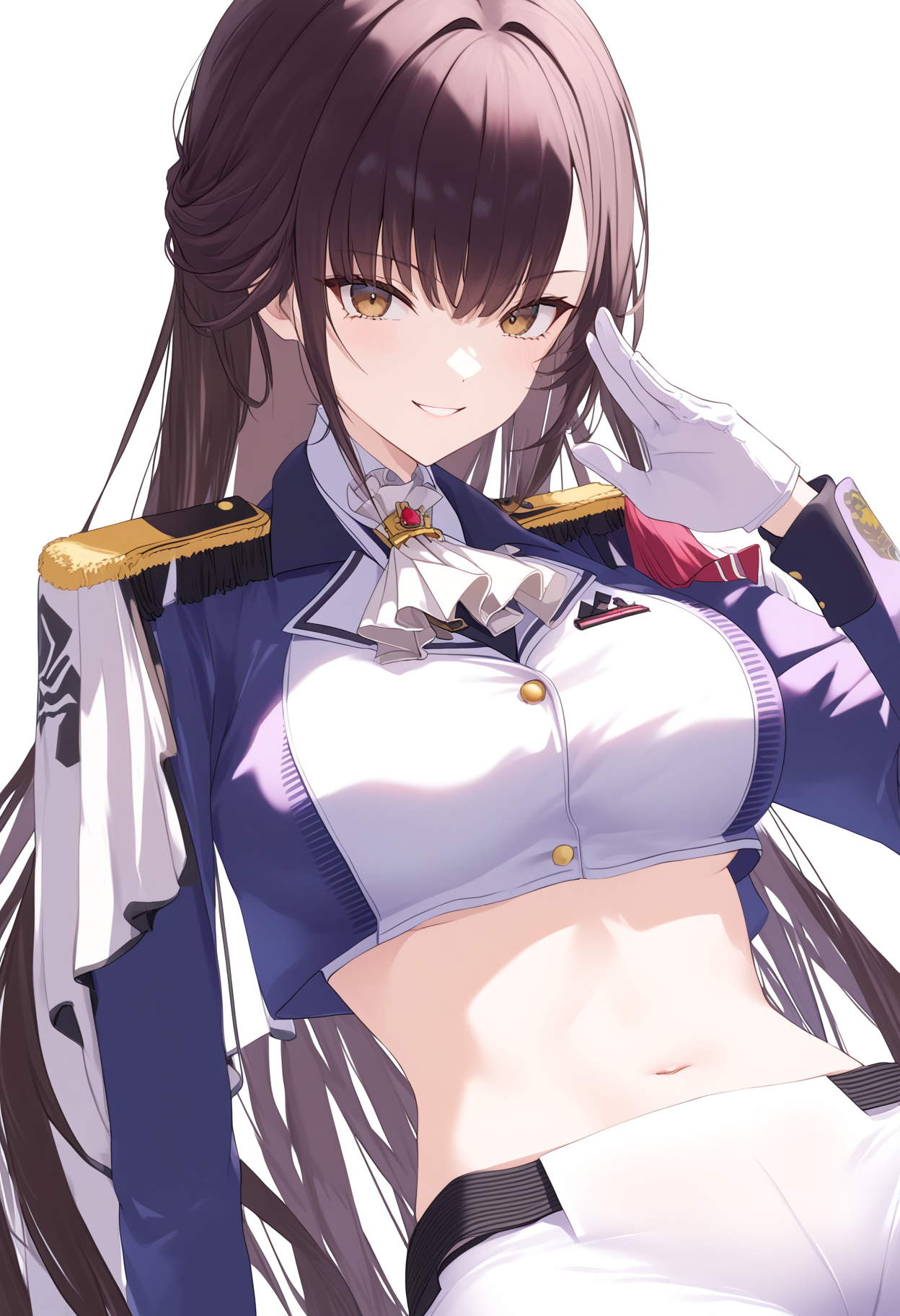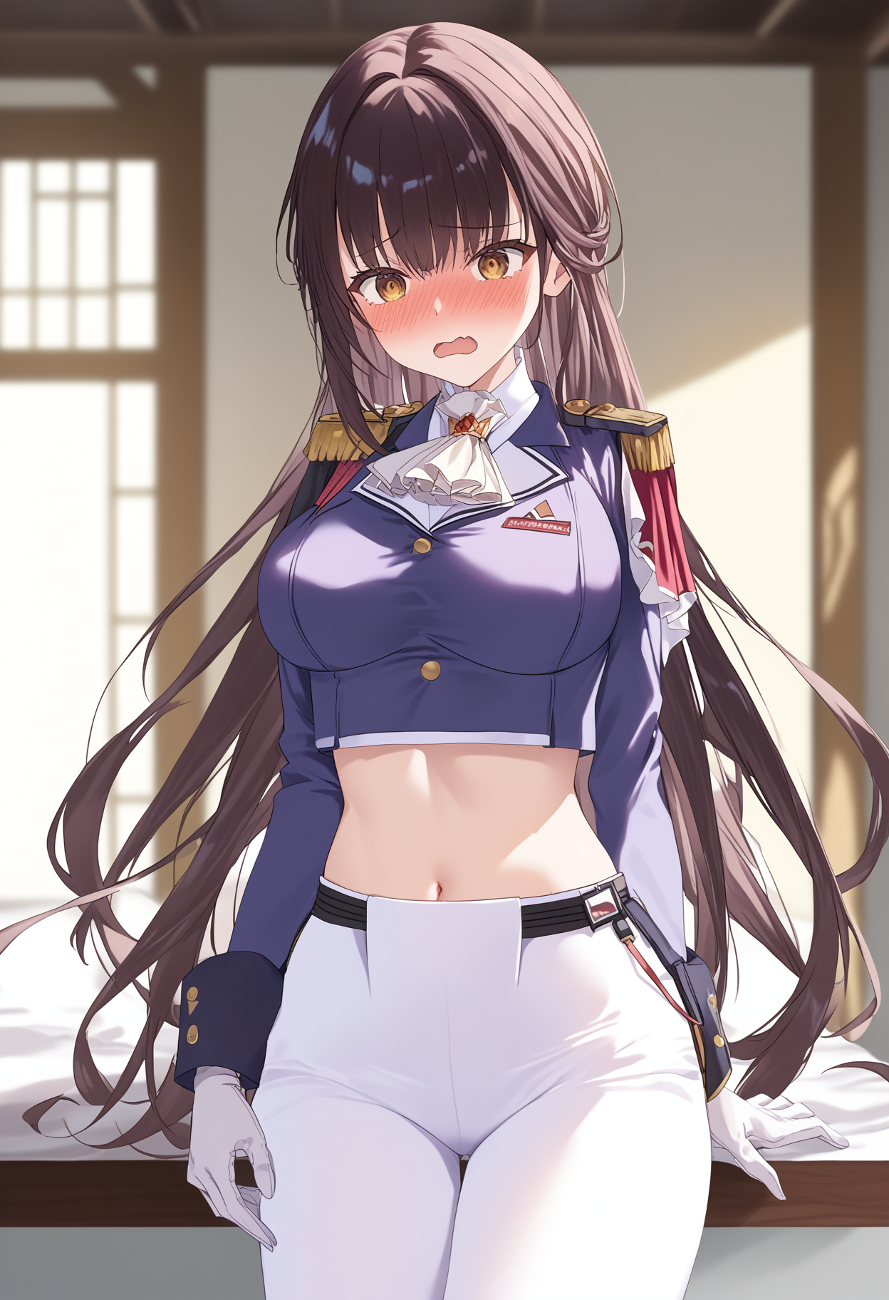 - white gloves, long sleeves, crop top, white pants, uniform, military uniform, ascot, epaulettes, blue jacket, thigh strap