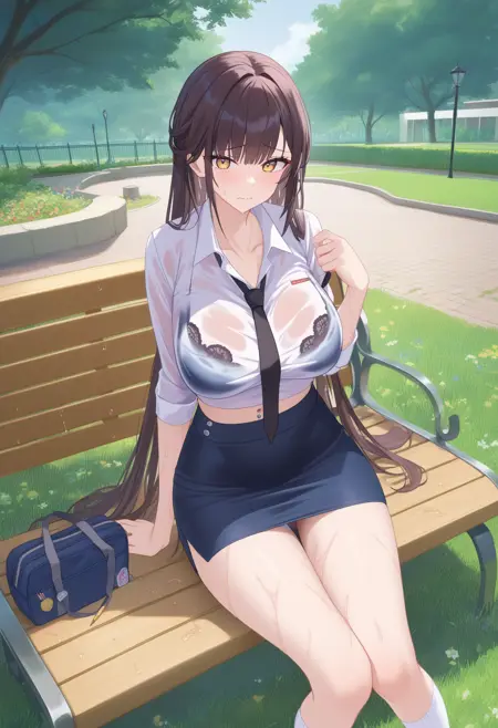 - MarcianaDef or Marcianaschool, long hair, bangs, large breasts, brown hair, yellow eyes,