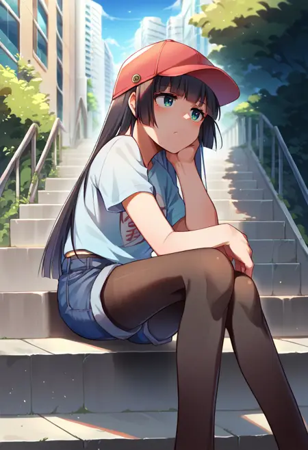 SoryuinAkemi, long hair, hime cut, light blue tank top, blue shorts