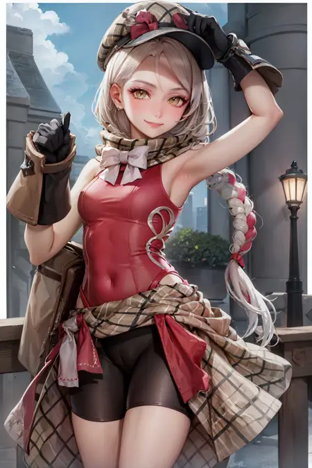 默认服装: 帽子,无袖,裙状遮挡物,骑行短裤,手套