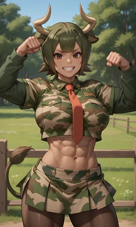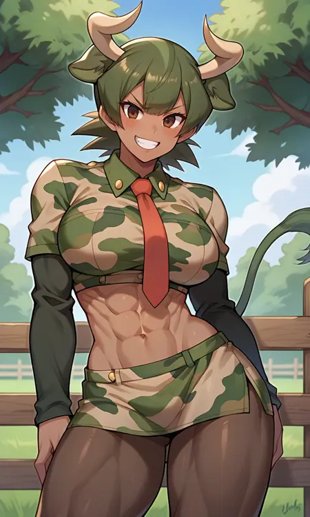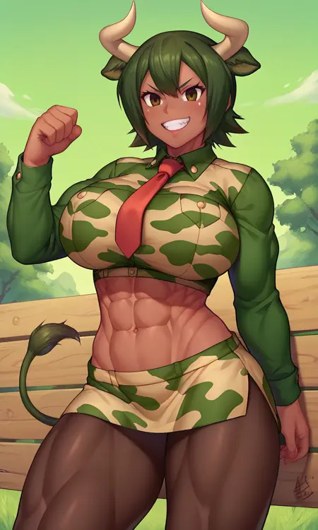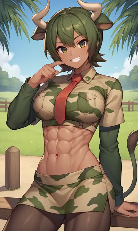| 학습된 단어 | score_9, score_8_up, score_7_up, score_6_up, score_5_up, score_4_up, abs, black pantyhose, camouflage crop top, camouflage skirt, collared shirt, cow ears, cow girl, cow horns, cow tail, dark skin, green eyes, green hair, hair between eyes, shirt over long sleeves, midriff, two-tone hair, navel, red necktie, sidelocks복사됨! |
