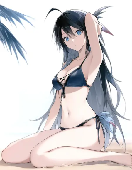 gutu,1girl,solo,blue eyes,long hair,black hair,ahoge,braid,bangs,hair between eyes,choker,feathers,ribbon,shirt,white shirt,collared shirt,