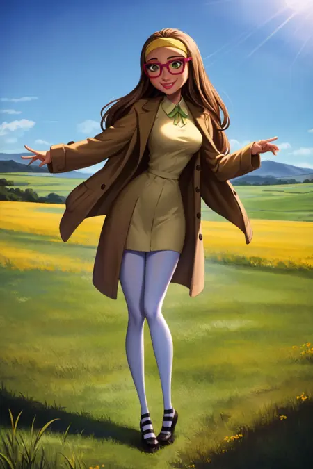 시민 의상: hlcivil, 헤드밴드, 긴 머리카락, 갈색 머리카락, 코트, 안경, 초록색 눈, 핸드백, 입술, 벌린 입, 화이트 팬티스타킹