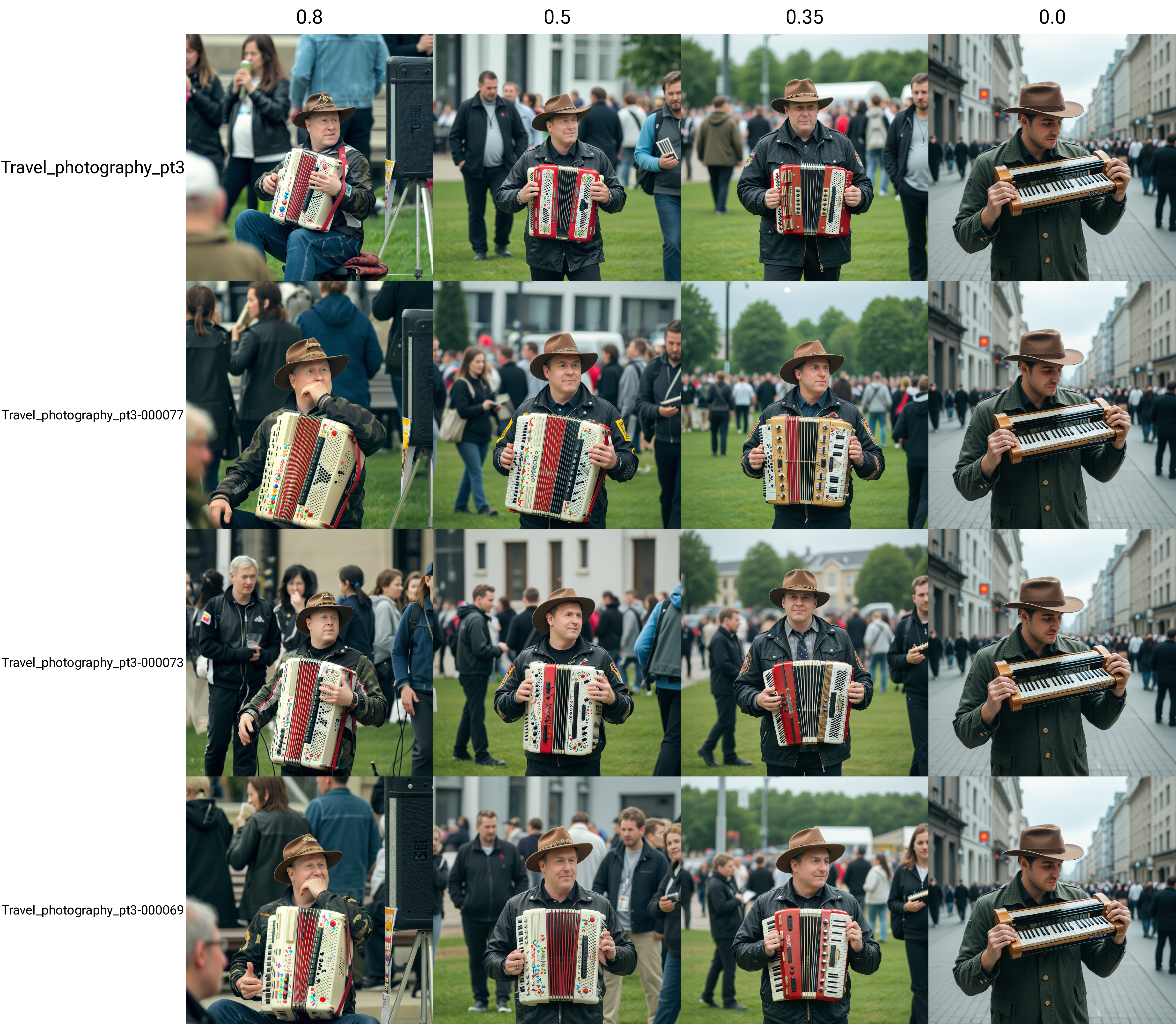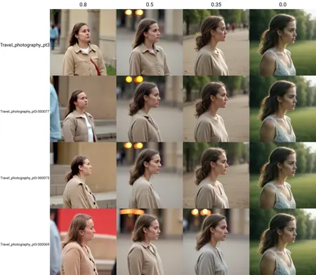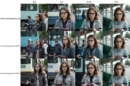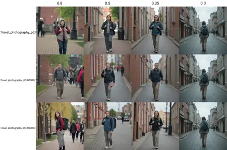该 LoRa 基于使用专业镜头拍摄的高分辨率旅行照片训练而成,具有浅景深效果。无特定主题,仅是随机选取的旅行照片(自然、街道、动物、人物等)。