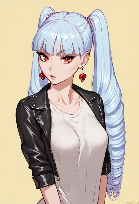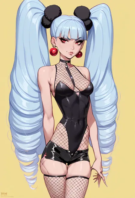 mrs._morgan_\(fellatrix\), 1girl, long hair, bangs, blunt bangs, light blue hair, twin tails, red eyes, slender, medium breasts, drill hair, earrings,