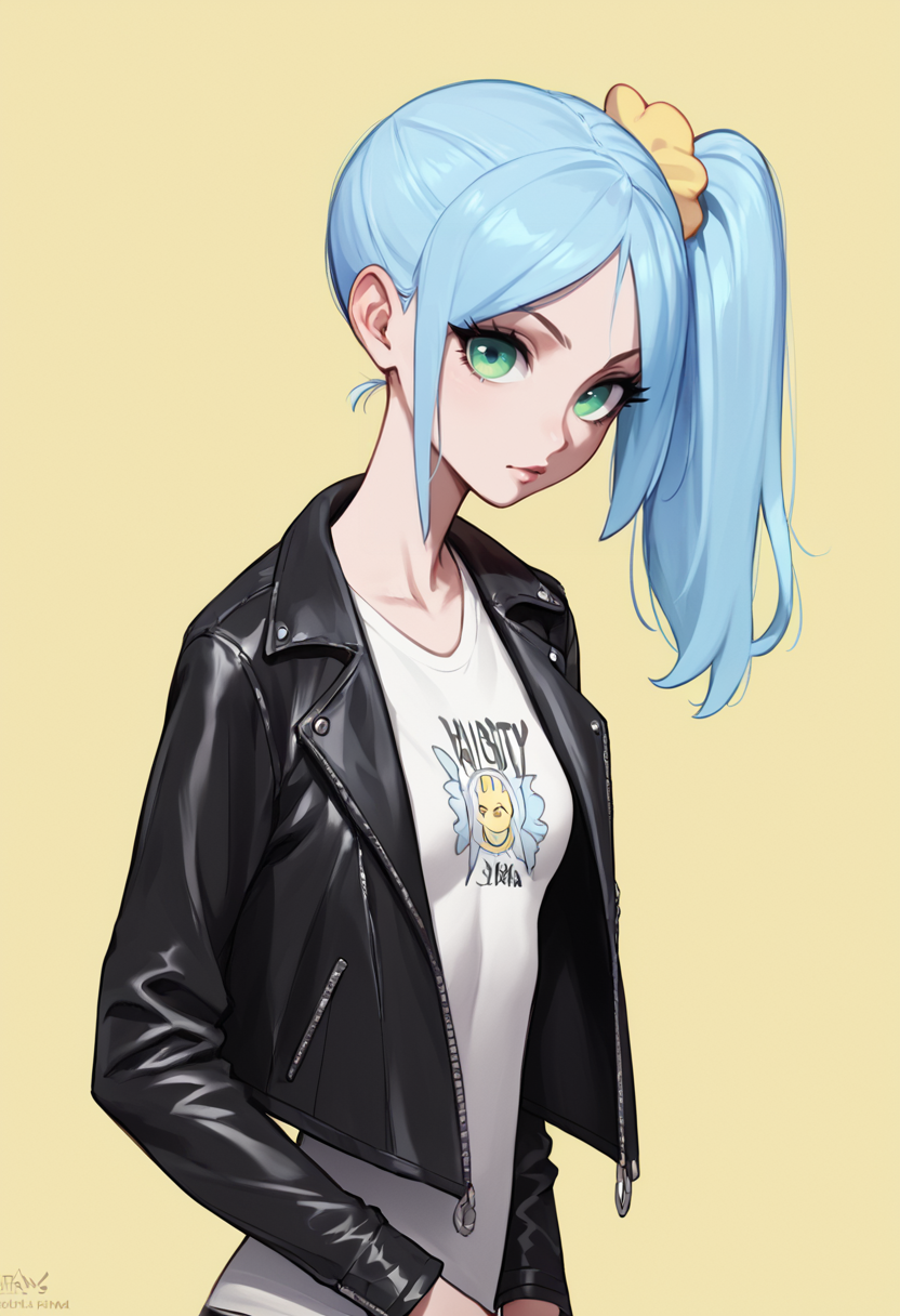 daisy_\(fellatrix\), 1girl, light blue hair, side ponytail, green eyes, small breasts, slender,