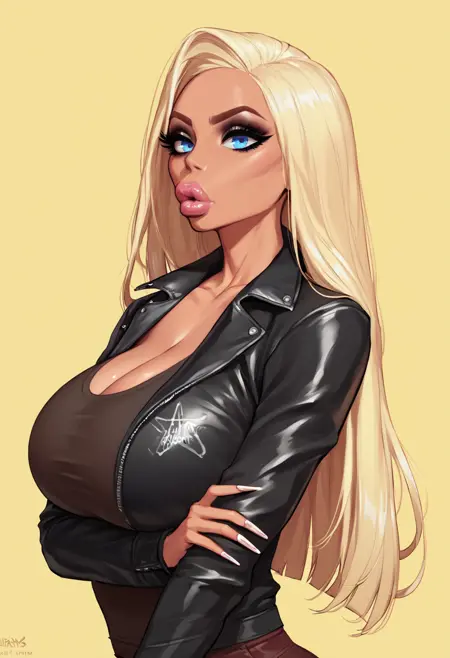 brittany_\(fellatrix\), 1girl, long hair, blonde hair, blue eyes, long hair, makeup, mascara, big lips, huge breasts, tan, dark-skinned female,