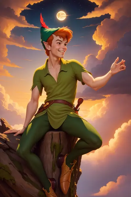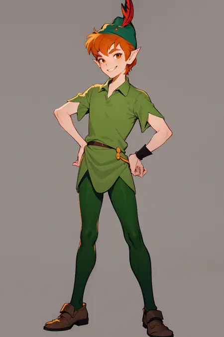 其他提示:短发,橙色头发,绿色裤子,绿色领衬衫,短袖,腰带,棕色鞋履,帽子羽毛,男性主视角,尖耳朵