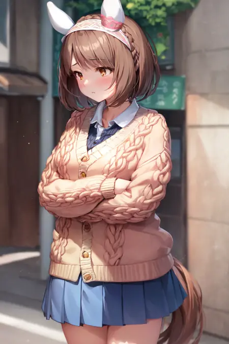 - casual, ear covers, headband, collared shirt, pink sweater, cardigan, cable knit, long sleeves, blue skirt, socks, white footwear