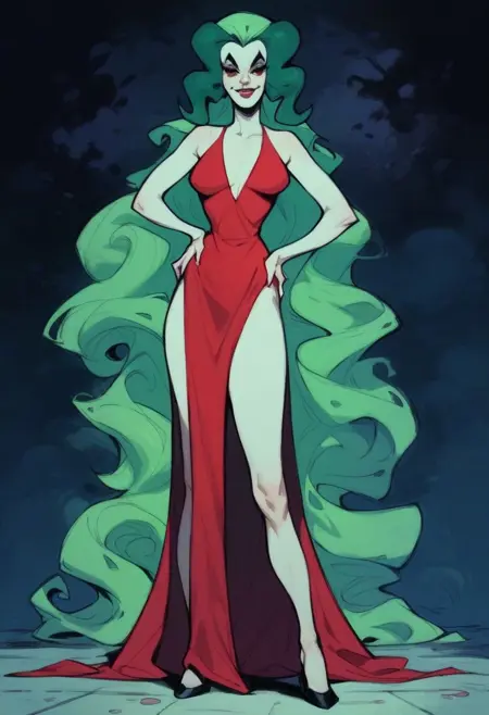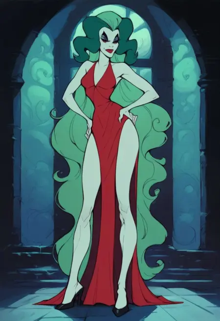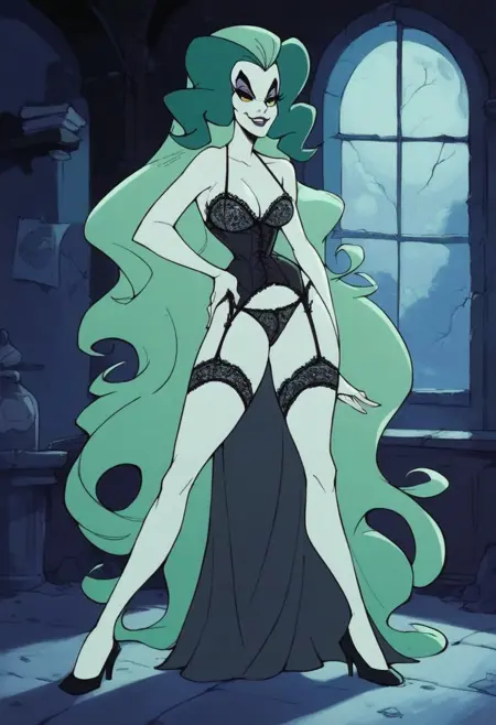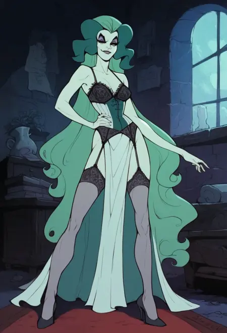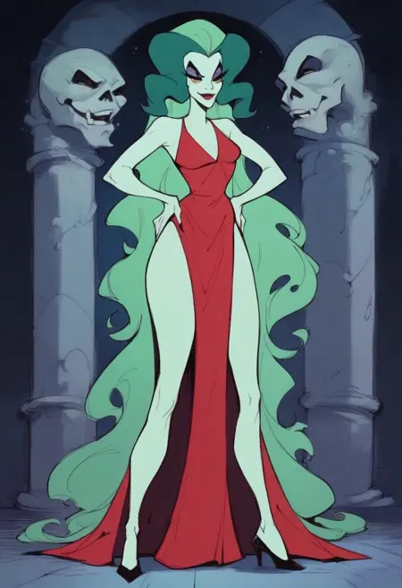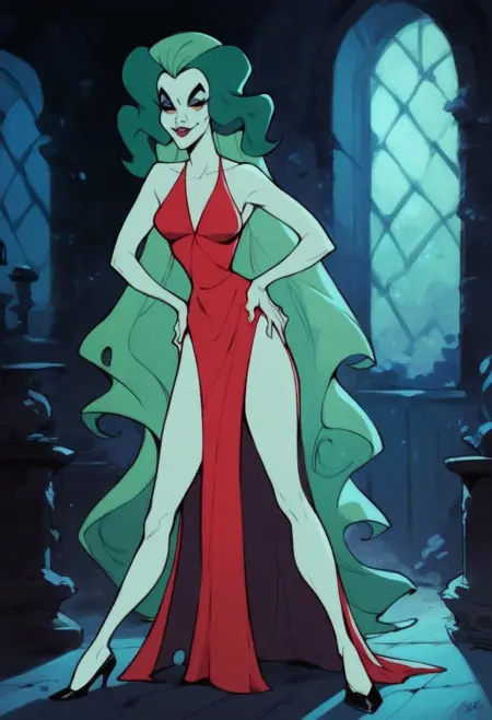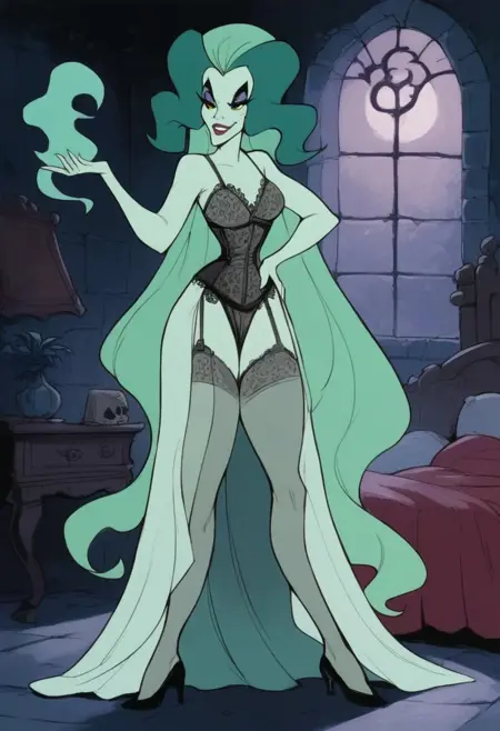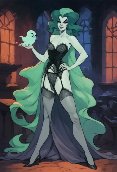 필마티온의 애니메이션에서 나온 또 다른 녹색 피부를 가진 우아한 여성 악당: 이번에는 그들이 오래된 텔레비전 시리즈의 이름을 빌려온 영화의 성공을 활용하려고 제작한 필마티온의 '고스트버스터스' 애니메이션에 등장하는 메이 웨스트처럼 들리는 유령, 애파라시티아이다.