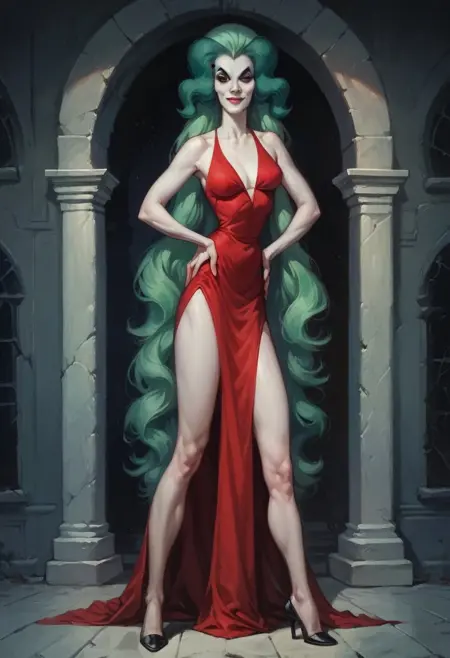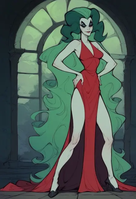 등장인물은 "애파라시티아, 여성 유령, 녹색 머리카락, 긴 베일", 옷차림은 "빨간 드레스, 하이힐".