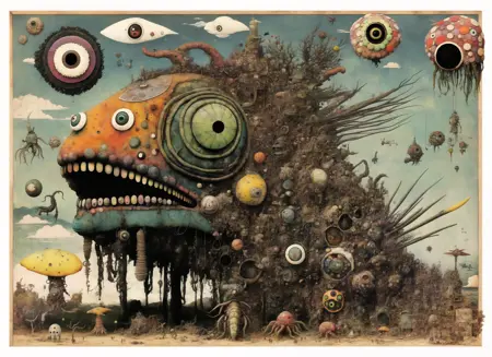 コラージュ、アセンブリ、ミックスドメディアを基盤とするゴンゾ&バイザロスタイル。主題は昆虫や昆虫のような怪物、他の動物を含む。