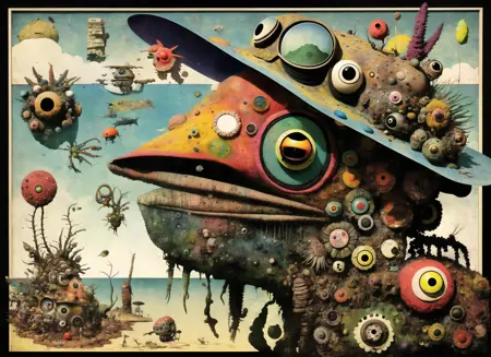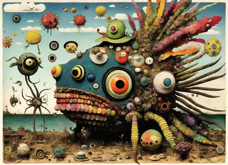 トレーニング時のキャプションに基づく追加キーワード:昆虫、怪物、ギア、紙、生き物、奇妙、ロボット、目、巨大、スクラップ、カエル、魚、鳥。