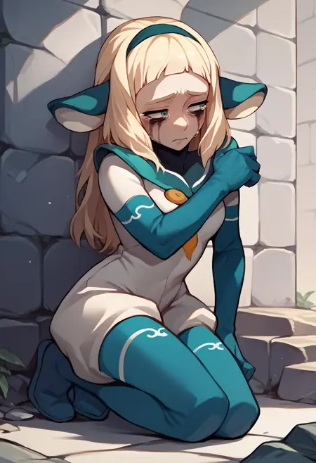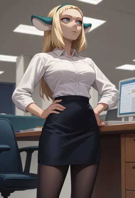 デフォルトの衣装: ヘアバンド、動物の耳、白いボディスーツ、青い手袋、肘まである手袋、青い太ももハイストッキング