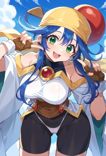 黄色いバンダナ、ヘアボブル、肩出し、オフショルダーのシャツ、白いシャツ、長袖、広い袖、黒いボディスーツ、タートルネックのボディスーツ、服の下にボディスーツ、指なし手袋、黄色い手袋、ベルト、バイクショーツ、スパッツ、バイクショーツの上にパンツ、黒い靴下,