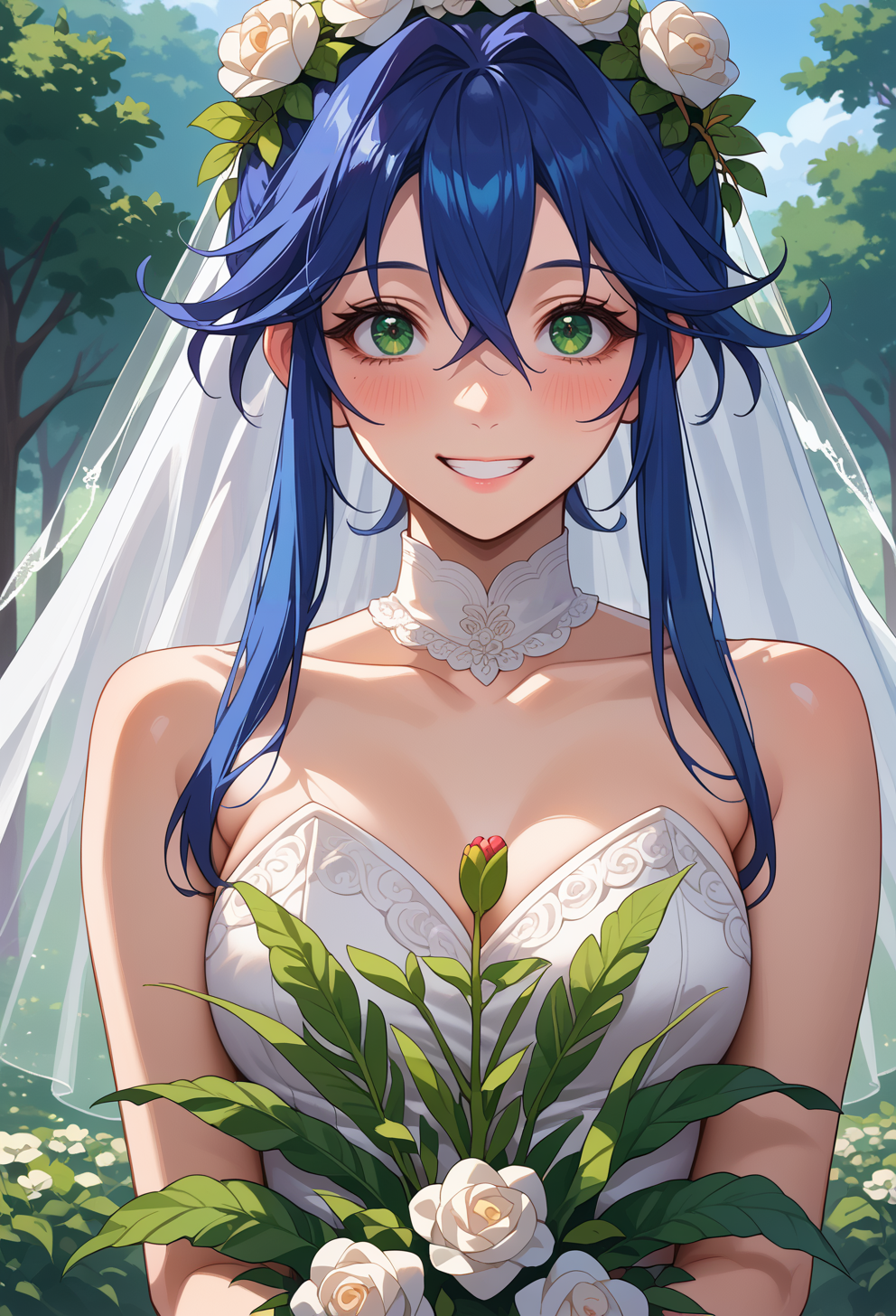 緑の目、青い髪、長いサイドロックス、短い髪に長い前髪,
