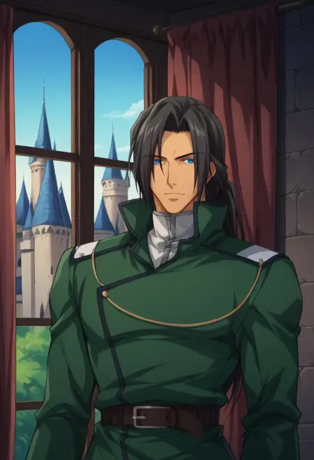 gwendal, 1boy, solo, male focus, uniform, long hair, military, military uniform, black hair, blue eyes, ponytail, belt, boots