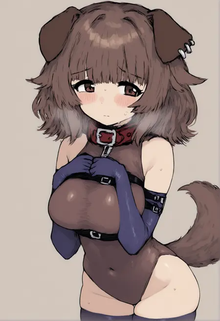 brown hair, short hair, messy hair, brown eyes, short eyebrows, thick eyebrows, fang, eyebrows visible through hair, dog girl, tan fur, animal nose, animal ears, dog ears, ear piercing, jewelry, animal collar, collar, choker, dog collar