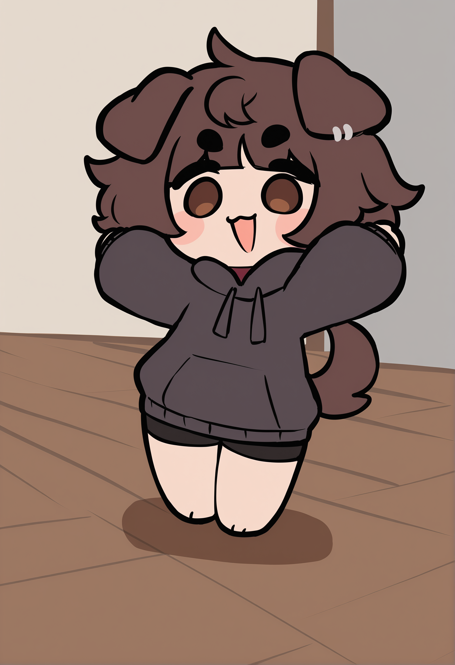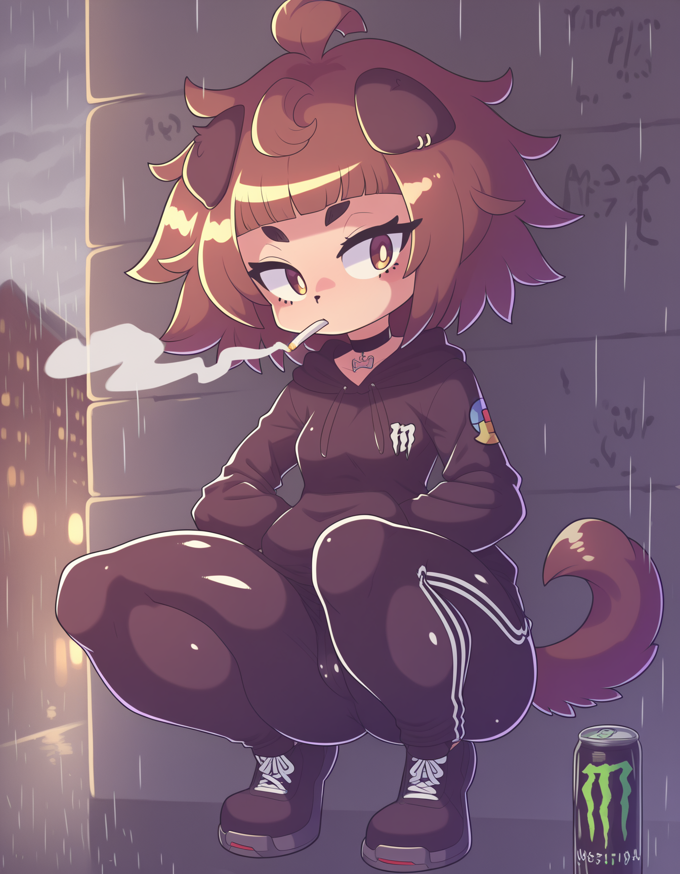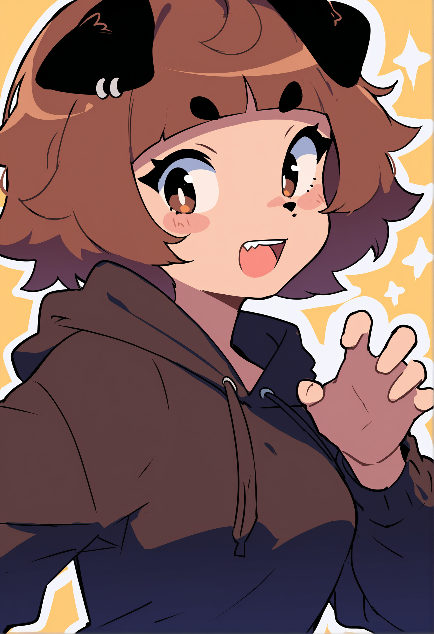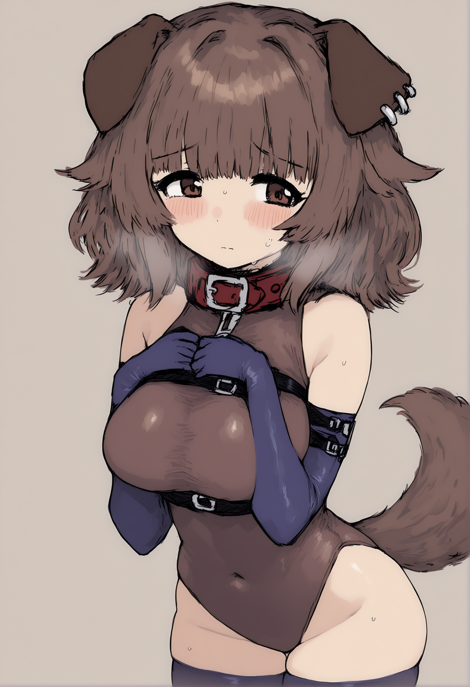 棕色头发,短发,凌乱头发,棕色眼睛,短眉毛,浓眉,尖牙,眉毛透过头发可见,狗娘,棕色皮毛,动物鼻子,动物耳朵,狗耳,耳环,珠宝,动物项圈,项圈,项圈,狗项圈