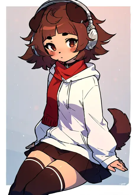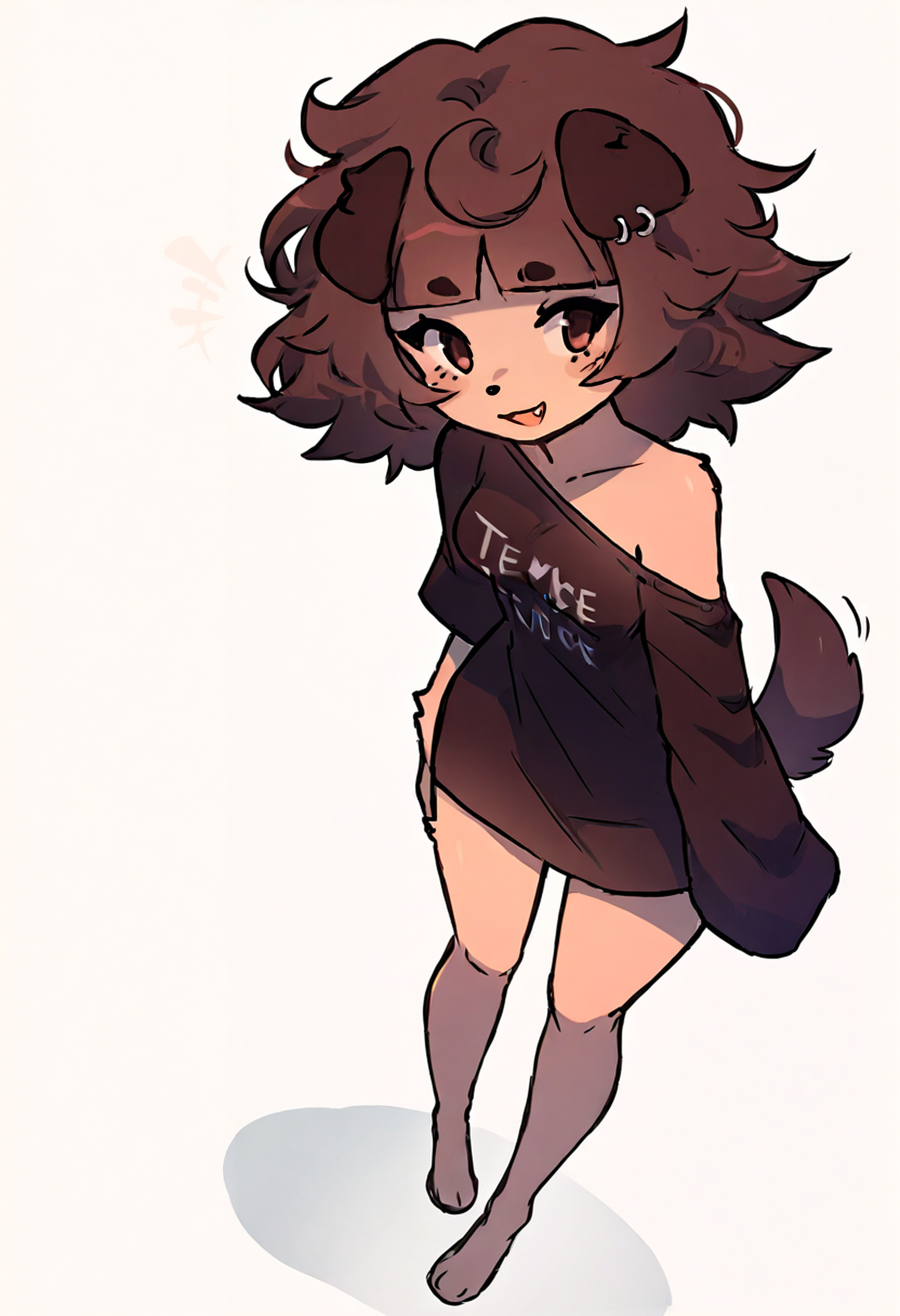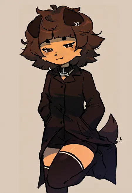 棕色头发,短发,凌乱头发,棕色眼睛,短眉毛,浓眉,尖牙,眉毛透过头发可见,狗娘,棕色皮毛,动物鼻子,动物耳朵,狗耳,耳环,珠宝,动物项圈,项圈,项圈,狗项圈