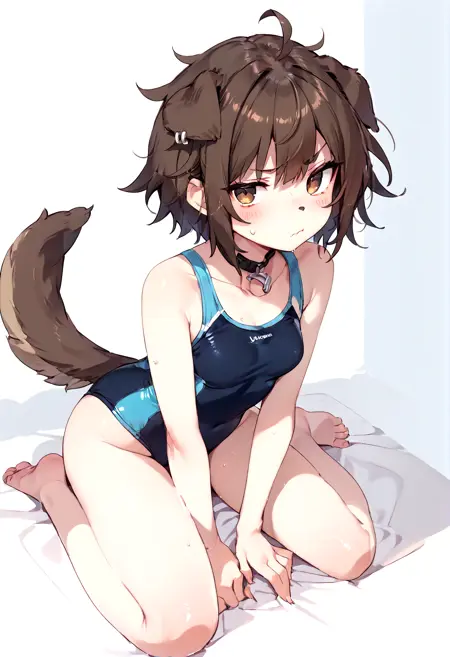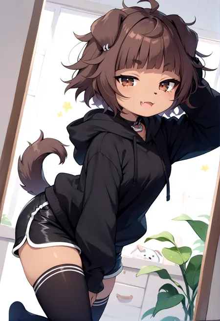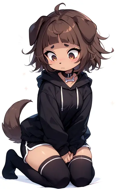 brown hair, short hair, messy hair, brown eyes, short eyebrows, thick eyebrows, fang, eyebrows visible through hair, dog girl, tan fur, animal nose, animal ears, dog ears, ear piercing, jewelry, animal collar, collar, choker, dog collar